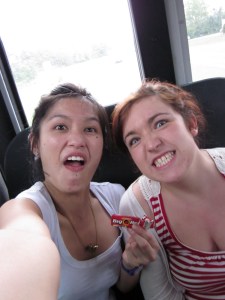 Eating Big Red with Irish Siobhan on bus ride to Target. The cinnamony taste of the gum is still so very weird to us:
