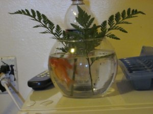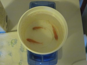 YES! one fish died Nat!..so sad. It was GROSS flushing down the toilet. But even more gross trying to get the two remaining fish out of the bucket and into the new bowl – you woulda SCREAMED for sure! hahaha..i wore gloves thankfully..but obviously fish outta water SQUIRM like mad! haha. The remaining two, AL and JES, are doing just fine.Yeh. Who's sending me flowers???…haha