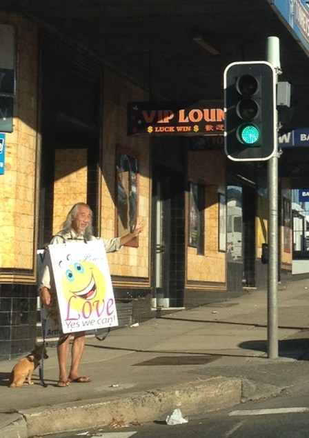 Sometimes when you’re just not having a great day what better way to cheer yourself up than be greeted by a hippy version of Mr. Miyagi, his little pup and a ‘pro-love’ message.