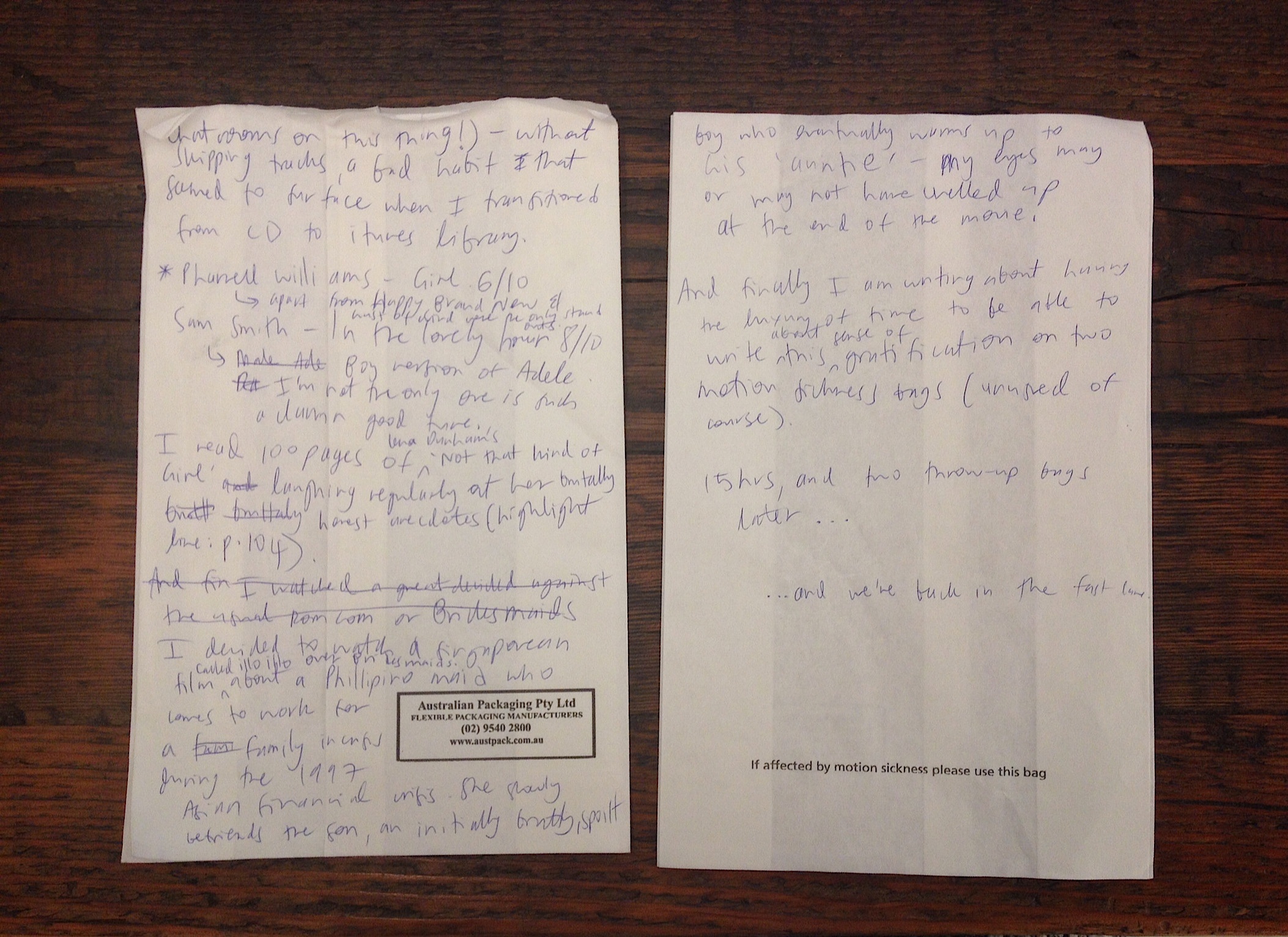 And finally, I have the luxury of being disconnected from reality to be able to write about having the luxury of being disconnected from reality – on two unused motion sickness bags, no less.